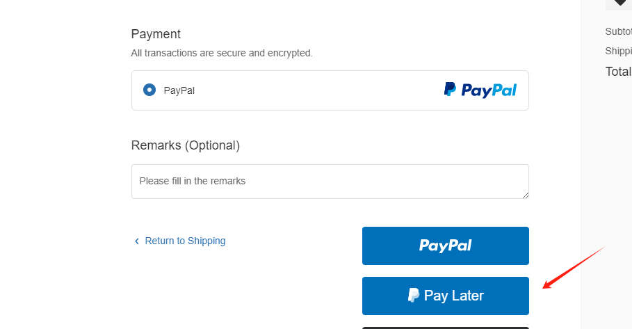 Step 2: Select PayPal as your payment method, then choose "Pay Later" to pay for your order.